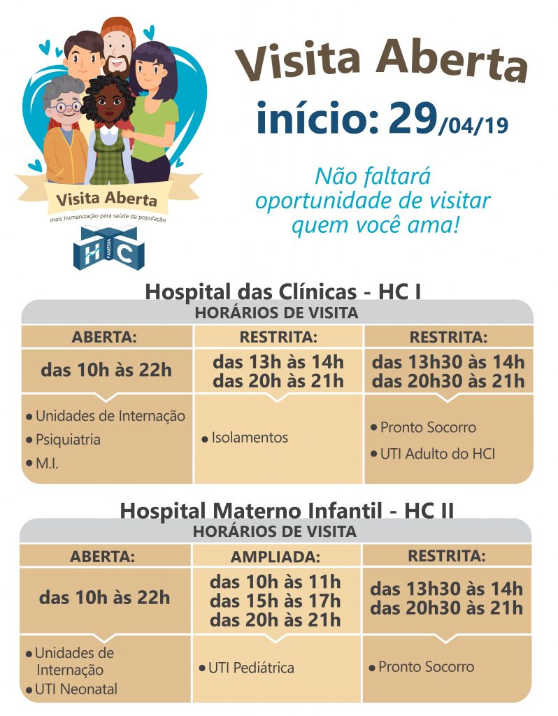 A Visita Aberta acontecerá nos Hospitais das Clínicas de Marília – HC I e no Hospital Materno Infantil – HC II, com horário ampliado das 10h às 22h, sendo permitida a entrada de 1 (um) visitante por vez, independente da presença do acompanhante.